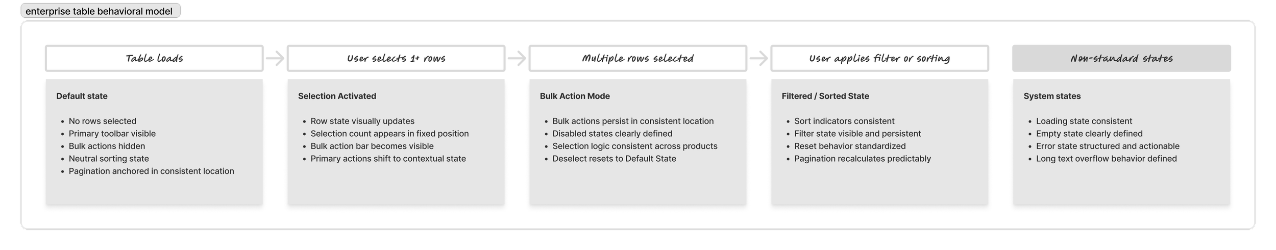 Rather than standardizing visuals alone, I defined clear interaction rules for how tables behave across different states. This reduced variation in implementation and helped align patterns across teams.